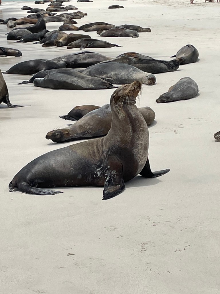 We explored a long, white-sand beach with dozens of Galápagos sea lions sleeping, nursing, and grousing at each other; covered with sand, sleek and wet, or half-and-half. Snorkeling off Gardner Island, we encountered schools of razor surgeonfish, streamer hogfish, and marine iguanas on the bluffs above the waterline.